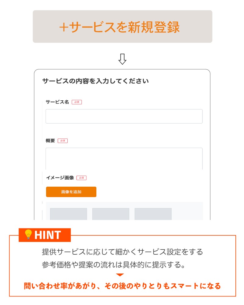 サービスの販売例です。基本プランでは9種類まで登録できますので、できるだけ細くサービス設定をして、具体的な参考価格を提示する事で、問い合わせ率や親和性をあげ、その後のやり取りをスマートに進められます。