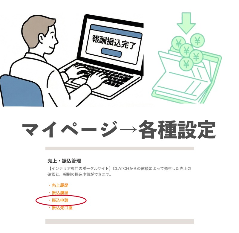 8.【プロ】完了後、マイページの「各種設定」メニューから振り込み申請をしてください。
